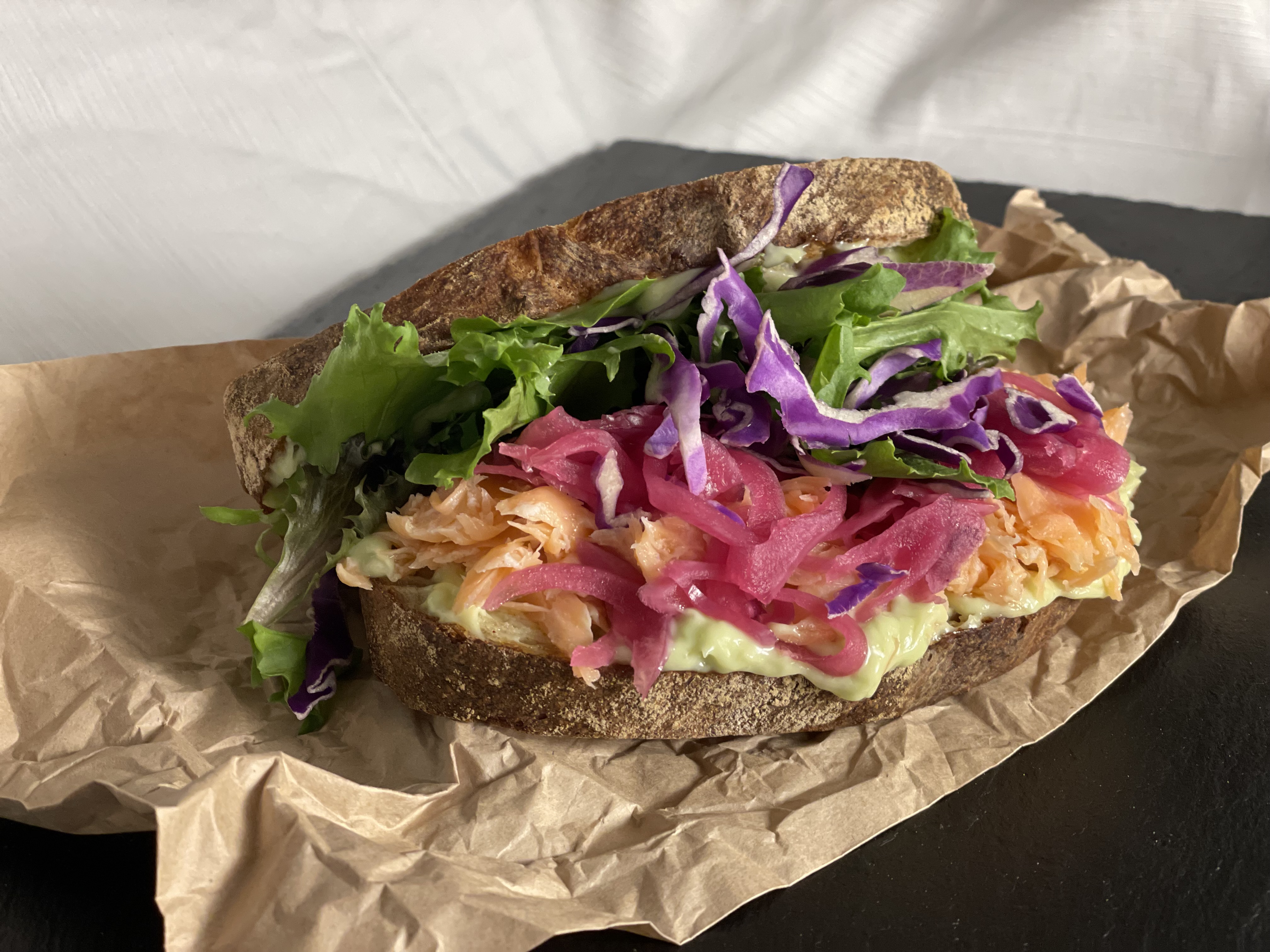 med urtemayo og syltede rødløg